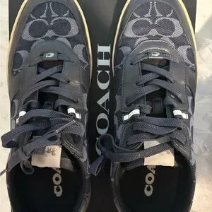 Stylish Coach sneakers. Navy and gray design. Comfortable fit. Perfect for casual wear.