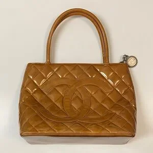 Stylish CHANEL shoulder bag in tan. Features quilted design and iconic logo charm.