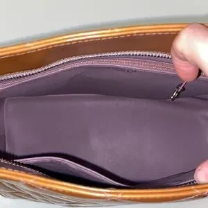 Caramel brown color, interior is a lavender purple. This bag is show stopping!