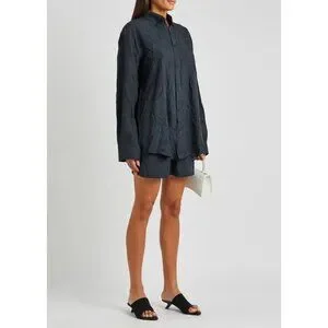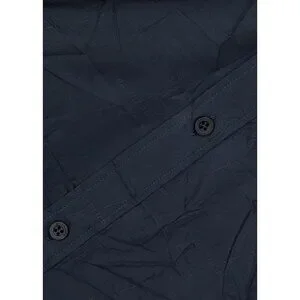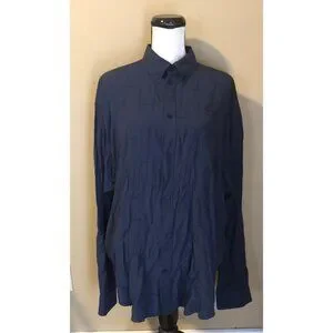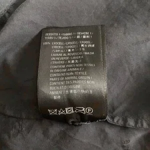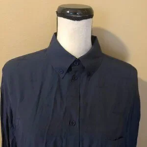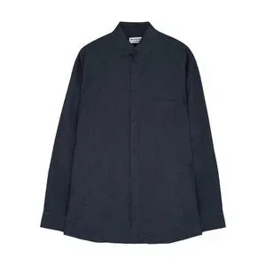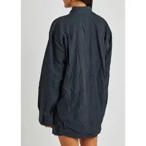 Balenciaga shirt is cut to an oversized fit with a fluid drape from the dropped shoulders and is worked with a crinkled finish for an effortlessly laid-back look. This long-sleeve style is topped with a button-down collar. Fabric is woven in a tone on tone logo jacquard pattern. Logo buttons. Long sleeves. Chest pocket. 100% lyocell, dry clean. In excellent condition. Deep navy blue fabric (so dark it reads as black in some lighting.) The small white size tag has been clipped, but the size (38) is printed on the fabric care tag. Authentic, of course. No flaws or wear apart from the missing size tag.