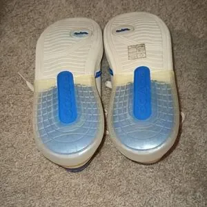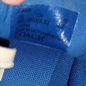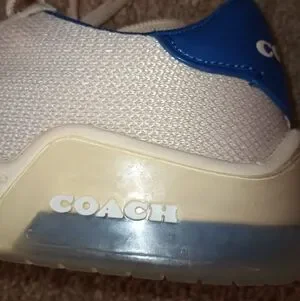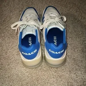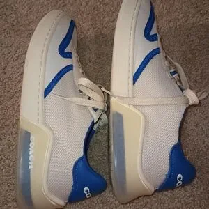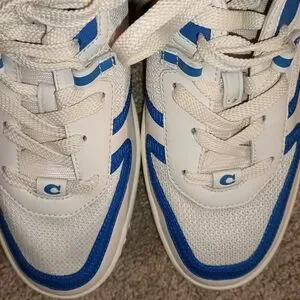 Stylish Coach sneakers. White base with blue accents. Comfortable and trendy.