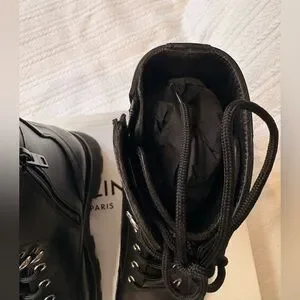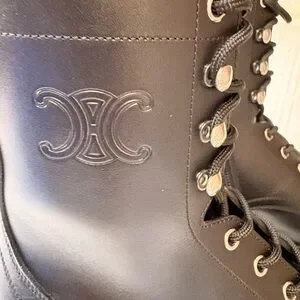 Elevate your look with these Celine combat boots. Sleek black leather with lace-up design. Rugged sole for style and grip.