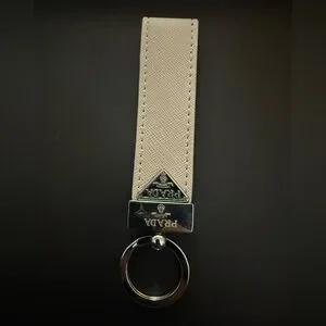 Brand new upcycled Sleek Prada key holder in taupe. Features silver hardware. Ideal for a refined touch. This item is upcycled, meaning it was repurposed from authentic designer materials (such as hardware, charms, fabric, or trims) and thoughtfully transformed into a new, one-of-a-kind piece.