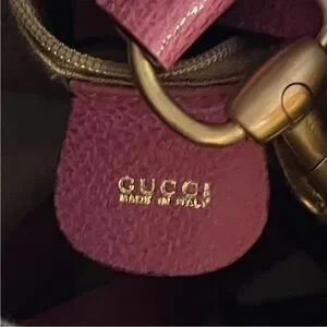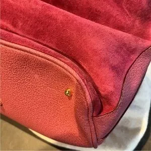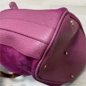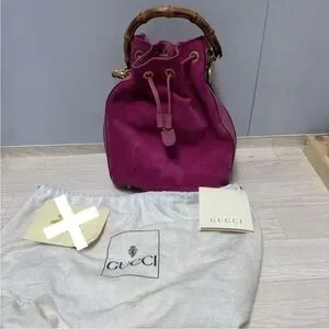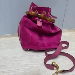Chic Gucci shoulder bag in vibrant fuchsia suede. Features a stylish bamboo handle.