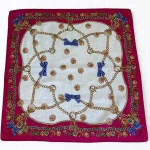 Luxurious Celine scarf with a pink border. Features intricate blue chain and bow design. Perfect for elevating any outfit.