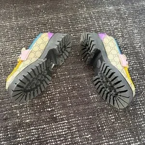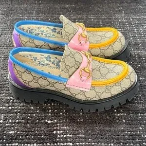 Stylish Gucci flats with vibrant multicolor design. Features gold accents and signature pattern. Perfect for casual wear.