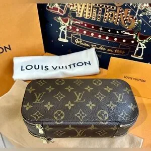Features monogram canvas wl 2 zipper sides, 1 w/ 3 stretch bands, a stretch side pocket, & the other zippered side includes 4 rounded stretch bands. Great case to organize your items.