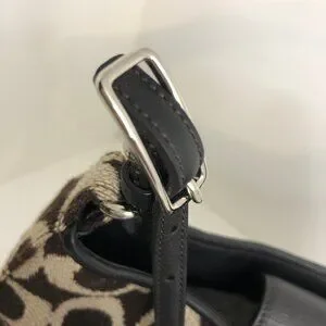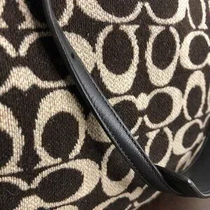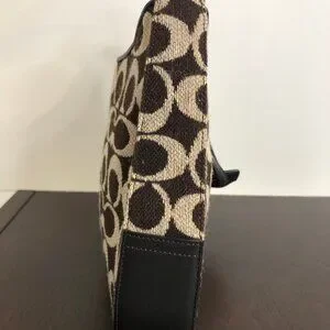 This is a vintage Coach Signature C shoulder bag made with a wool exterior and black leather trim. Expertly crafted with Coach's signature wool cream fabric and luxurious brown leather, the Coach Signature Wool Cream Shoulder Bag exudes sophistication and style. The elegant magnetic opening reveals a spacious interior, complete with a convenient zip up pocket, making it the perfect accessory for any occasion. This bag is stunning. No returns.