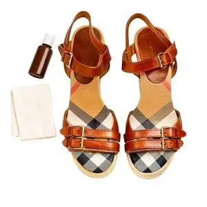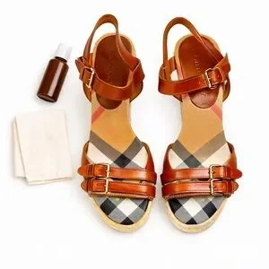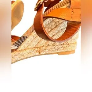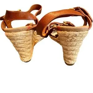 Burberry Tan Leather Check Canvas Espadrille Wedge Sandals Italy Size 35 in GUC