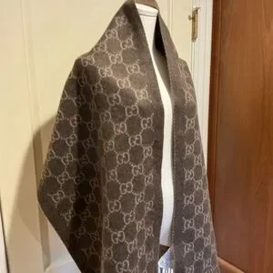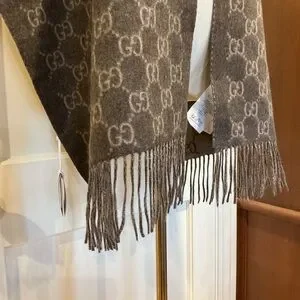 Luxurious Gucci shawl with iconic GG design. Soft texture with fringe ends. Ideal for a chic look.