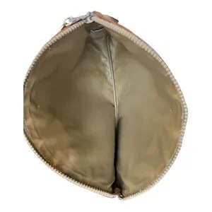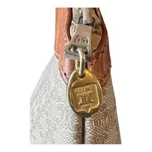 EUC Vintage Celine Macadam clutch bag or pouch. This bag features the iconic intertwined "C" monogram pattern on a coated canvas body, with contrasting tan leather trim and a top zipper closure.