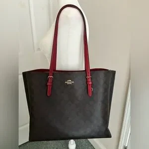 Used Coach tote with signature brown pattern. Features bold red straps. Perfect for daily use.