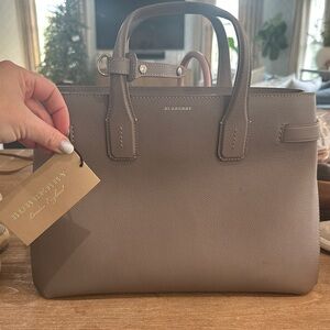 Chic Burberry tote in beige leather. Features sturdy handles and minimalist style.