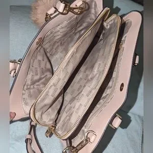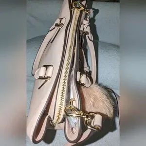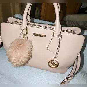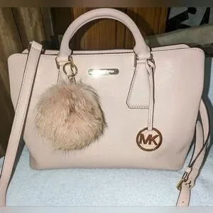 Beautiful soft pink saffiano leather with gold hardware satchel bag by Michael Kors. Three compartments with zipper closure middle one. Side ones are magnetic closure. One zip pocket and four slip pockets inside. Two rolled handles 5" drop. Adjustable and detachable crossbody strap. Michael Kors pom pom key holder included.Bag is in very good pre-owned condition. Some wear on bottom feet as shown in the picture. 13"-9.5"-4"
