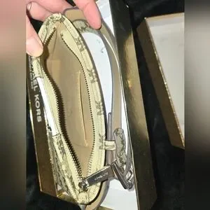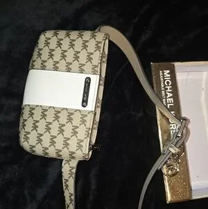 Chic belt bag with iconic MK logo. Features beige and brown tones. Adjustable strap for comfort. size S/M.