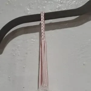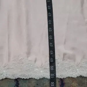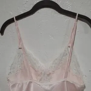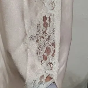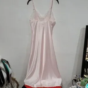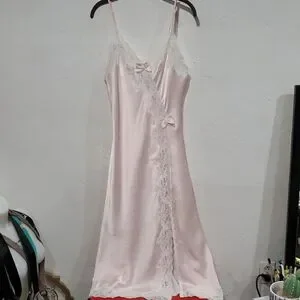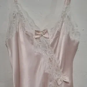 Experience comfort and elegance with this beautiful light pink satin nightgown, featuring delicate see through lace, bows and braided straps