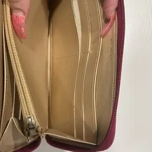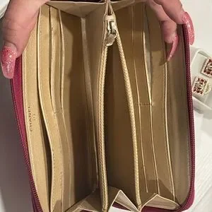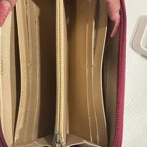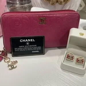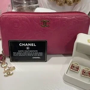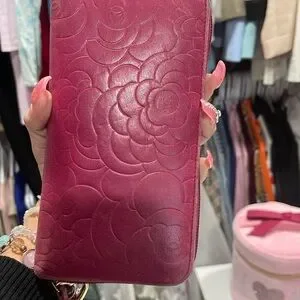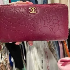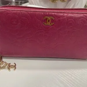Chic CHANEL wallet in vibrant fuchsia. Features floral embossing and iconic logo. Perfect for adding a pop of color.