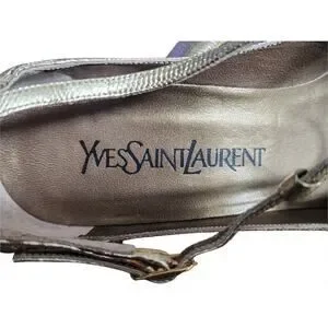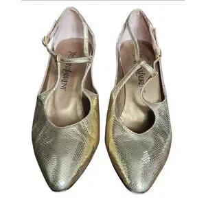 Vintage Yves Saint Laurent gold metallic leather heels with python-embossed finish and a classic stiletto silhouette. Italian made quality with a flattering cutout Mary Jane style and adjustable buckle. Size 7.5M.