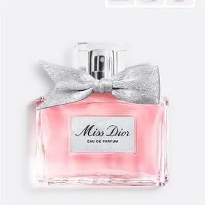 Elegant Miss Dior perfume. Pink bottle with silver bow. Luxurious and timeless.