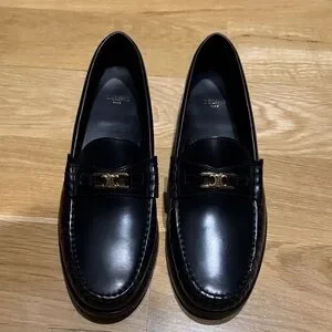 Elegant black leather loafers by Celine. Features a stylish gold accent. Ideal for versatile wear.