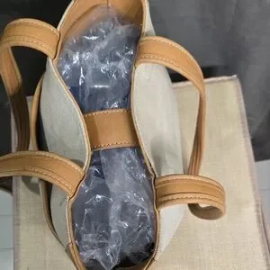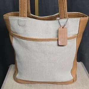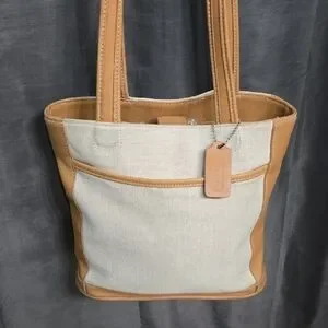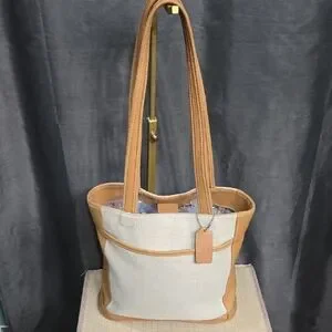Elegant Coach tote with tan leather trim. Cream canvas body.