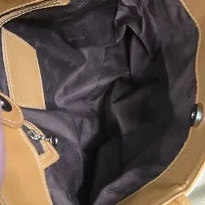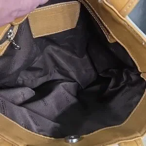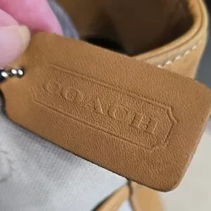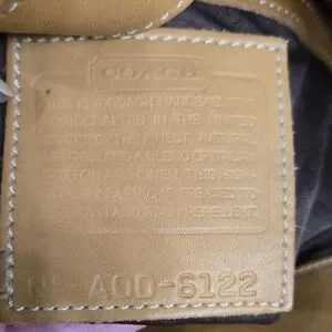 This 2000 Coach tote has a snap top closure and a zippered pocket inside. The hang tag is stamped Coach on both sides. There is some rubbing on the corners and a few marks on the bottom of the bag. The inside is clean, no rips, stains or odors. There is a large pocket on the front side of the bag.