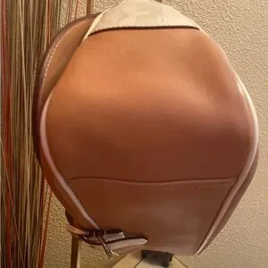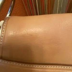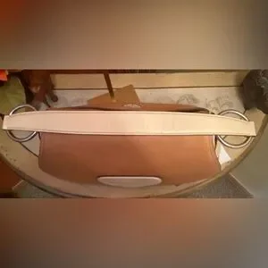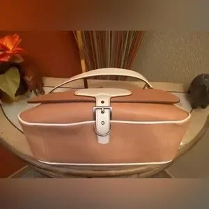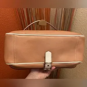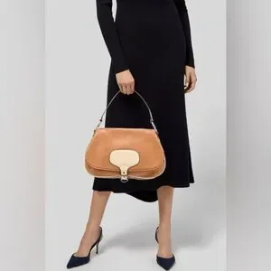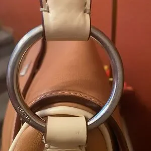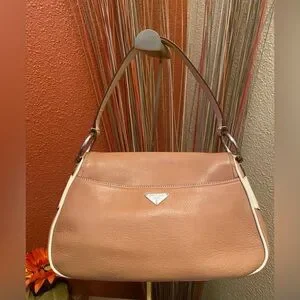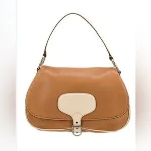 Stylish Prada shoulder bag in tan and cream. Features a chic design with a secure buckle closure. Prada Vitello Daino Leather Shoulder Bag, also sometimes referred to as a saddle bag due to its shape. It features a combination of nude/sabbia) pebbled "Vitello Daino" leather and a smooth, white patent leather accent on the front flap with silver-tone hardware.
