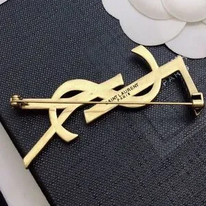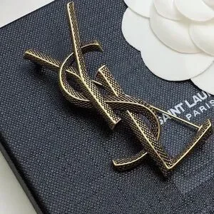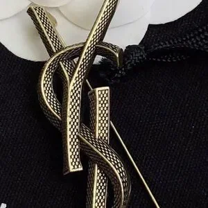 Chic Saint Laurent brooch with a twisted design. Black and gold hues. Adds sophistication to any look.