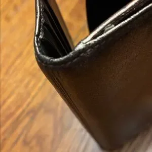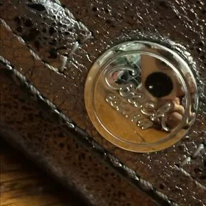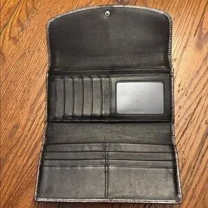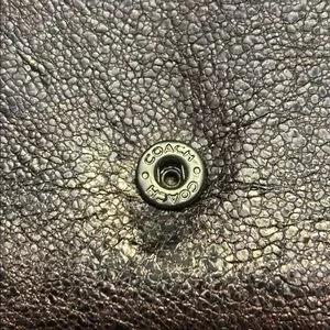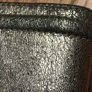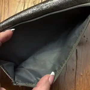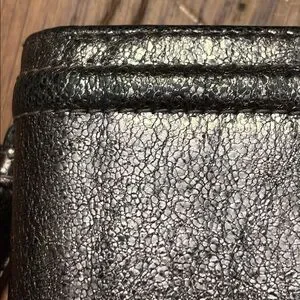 Coach envelope-style wallet. Crafted from high-quality pebbled leather with a shimmering metallic pewter finish, it perfectly balances luxury and durability. Elegant flap closure with a signature Coach-engraved silver-tone button. Authentic pebble-grain leather with a subtle metallic sheen. overall, in really good condition minor scratching on the interior corners are all good zipper runs very smoothly. Minor surface scratches on the hardware. Please look at all pictures closely.