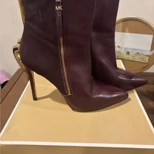 Worn once. Leather and cowhide. Step out in style with these elegant burgundy stiletto boots. Perfect for any occasion, these boots offer a sleek and sophisticated look.