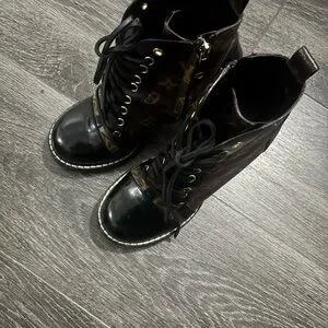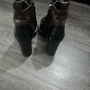Elegant lace-up boots with iconic monogram design. Stylish black and brown combination. Perfect for elevating any outfit.