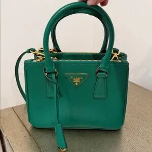 Chic Prada mini bag in vibrant green. Features luxurious leather and gold accents. Perfect for any occasion.