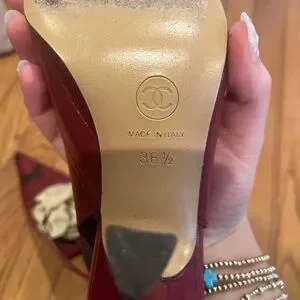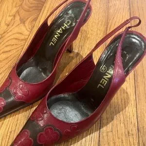 Chanel Red Floral Logo slingback Heels, Leather, dark red/burgundy and black with flowers, size 36 1/2, pretty sure it's a US 6, amazing condition, lightly worn, taken great care of! feel free to offer!! ❤️❤️♥️♥️