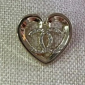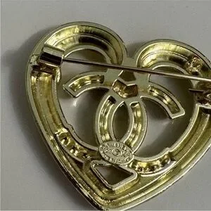 Elegant gold heart Chanel brooch adorned with sparkling crystals. Perfect for adding a touch of luxury to any outfit.