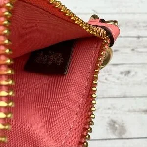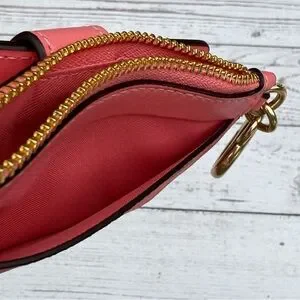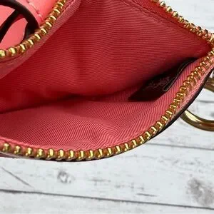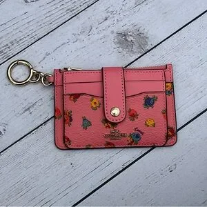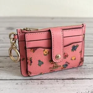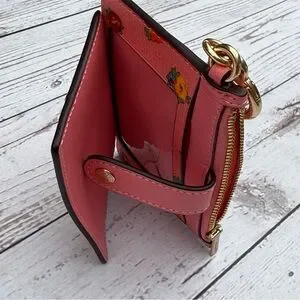 Chic pink card holder with floral design. Features multiple card slots. Gold-tone key ring and snap closure.