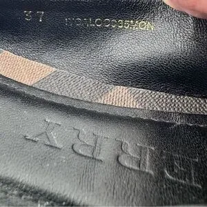 Chic Burberry flats with a checkered pattern. Features glossy black toe caps. Ideal for versatile styling.