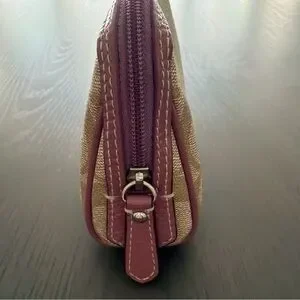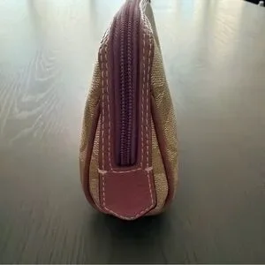 Authentic Coach Signature cosmetic pouch in tan coated PVC with leather trim. Lightweight, durable, and easy to use.
