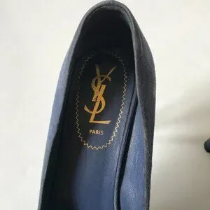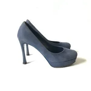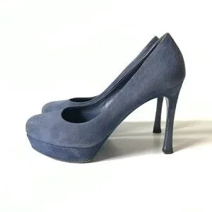 YSL Palais Platform Heels Pumps Womens 37.5 7.5 Blue Suede Yves Saint Laurent