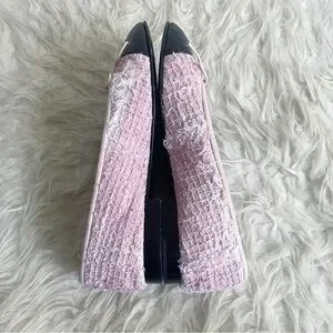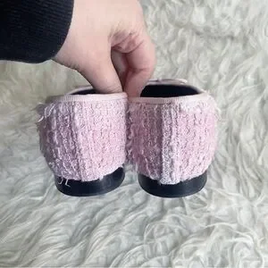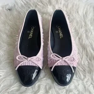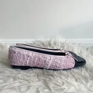 Chanel Pink Tweed Ballerina Flats Black Patent Leather Cap Toe CC Logo size 38