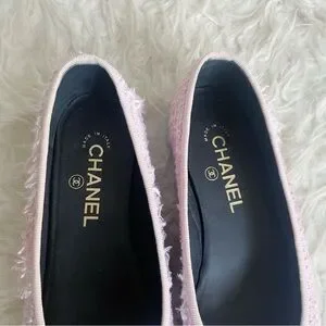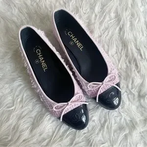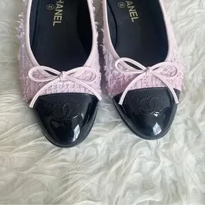 Beautiful pink tweed ballet flats with a black patent leather cap toe. Classic Chanel logo embroidered at toe with bow. Preowned, authentic. Comes with dust bags.