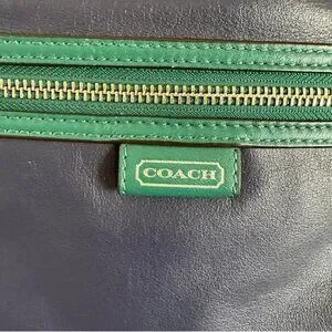 Gently used Coach Daisy Spectator Emma Tote Genuine Leather in Moonlight Blue with Green trim and beige accents.