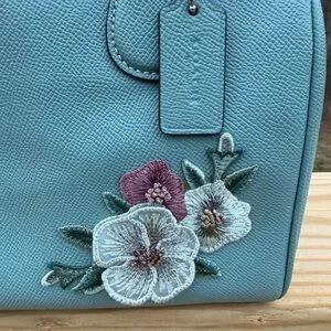 Chic Coach satchel in blue/teal EUC. Features elegant floral appliqués, silver tone hardware, zip top closure. Perfect for any occasion.