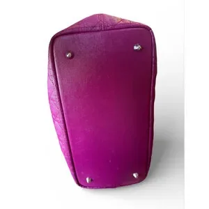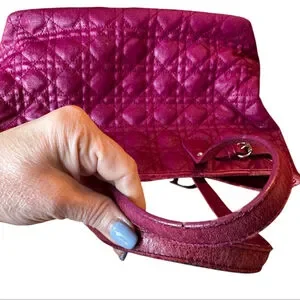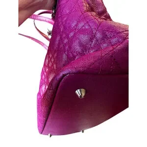 This pre-owned Christian Dior Cannage Panarea tote bag in magenta features a quilted coated canvas exterior with a diamond pattern. It has two top handles and silver-tone hardware, including a "Dior” charm. The bag has a structured base with four protective metal feet. Visible signs of wear include some fading and creasing on the leather handles and edges, as well as scuffs on the hardware. There are a few very small scratches in the coated canvas that are difficult to see. The interior is lined in a matching magenta fabric and includes a zippered pocket. COA card is included.