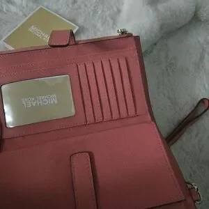 Elegant Michael Kors wristlet in a vibrant coral hue. Ideal for essentials on the go.