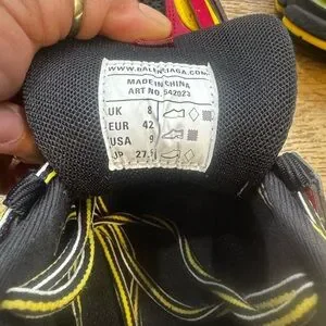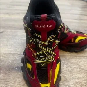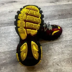 Dynamic Balenciaga shoes in burgundy and black. Features striking yellow details.