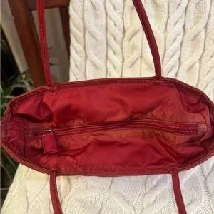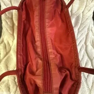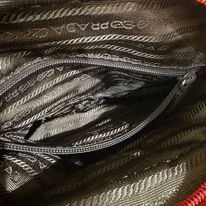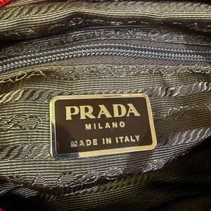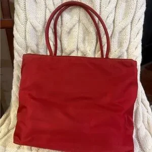Chic Prada tote in vibrant red. Sleek design with iconic logo. Ideal for everyday elegance. Exterior of bag shows signs of use that includes scratches on hardware, small light stains, and moderate color fading near zipper as shown in photos. Interior of bag is clean and shows little use. Item is priced for quick sale due to wear. Bag comes with COA.