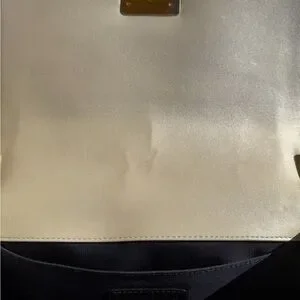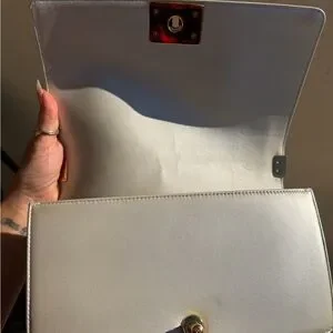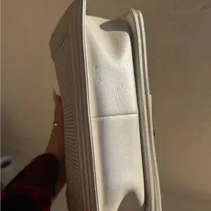 Chic Chanel shoulder bag in white. Features a striking gold chain. Iconic logo detail adds elegance.
