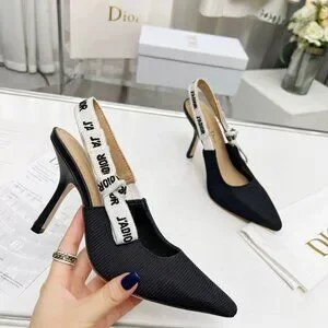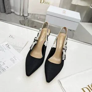 Chic Dior heels with a stylish slingback design. Features a black body with white accents. Ideal for elevating any outfit.