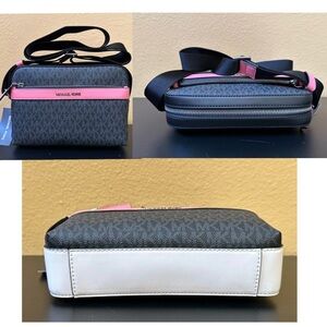 Chic crossbody bag by Michael Kors. Black with pink stripe and white accents. Compact and stylish.