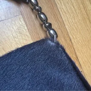 Featuring a cloth front beaded with silver and pearl beads, back is a black calf/pony hair